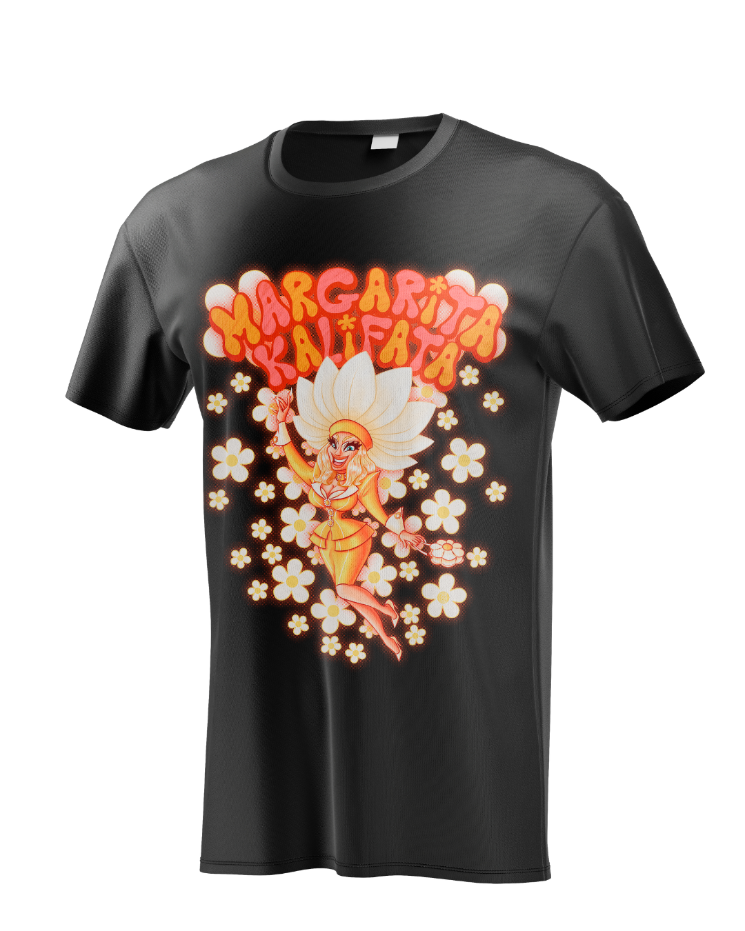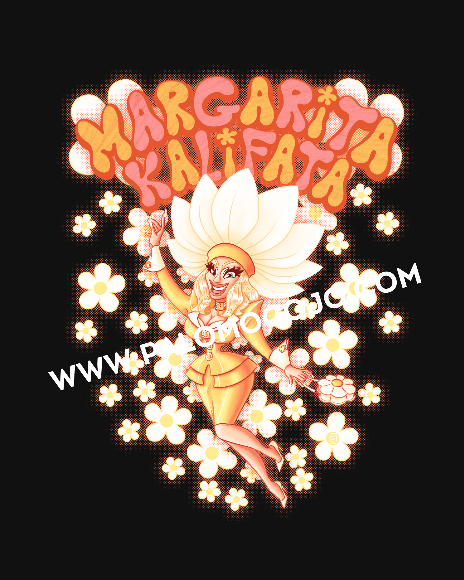 Margarita Kalifata la Tata de Córdoba y concursante de Drag Race España temporada cinco. Camiseta oficial 100% algodón en la tienda de Palomocojo. Consulta el tallaje más abajo.
